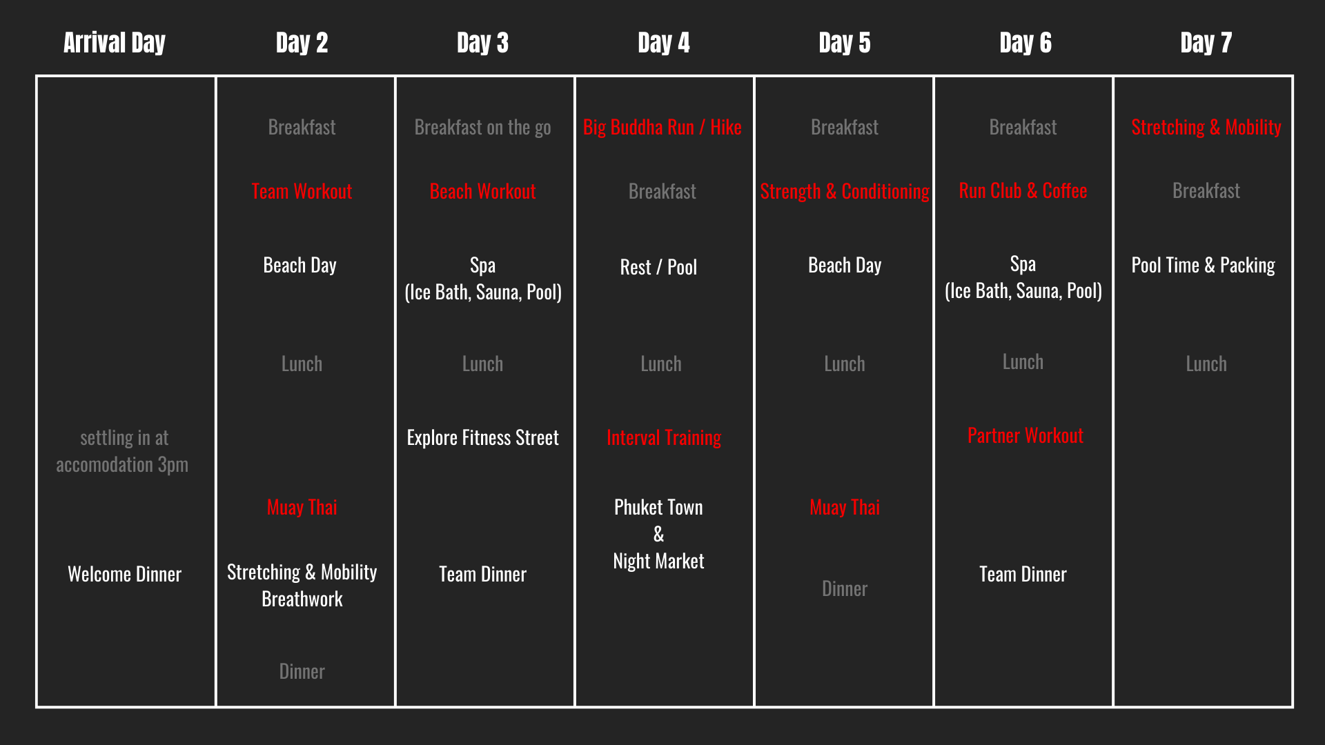 Our goal is not just to make you fit, but to have fun with every single workout. You will participate in a wide variety of workouts, on the beach, in the gym, in the studio or even in the boxing ring.